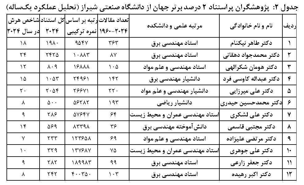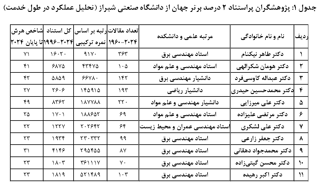 بر اساس جدیدترین گزارش سالانه انتشارات Elsevier از عملکرد استنادی پژوهشگران جهان که براساس شاخص‌های استنادی از پایگاه Scopus منتشر شده است؛ مطابق عملکرد استنادی در طول خدمت 11 پژوهشگر و مطابق عملکرد استنادی یک‌ساله در سال گذشته 12 پژوهشگر دانشگاه صنعتی شیراز در شمار پژوهشگران پراستناد ۲ درصد برتر جهان در سال 202۵ قرار گرفته‌اند.